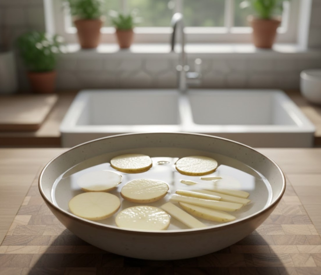 - Вымачивание в теплой воде. Очищенные клубни нарезают и заливают водой с температурой около 40–45°C на 20–30 минут. Теплая вода способствует более активной диффузии сахаров из клеток. После этого воду сливают, а картофель промывают в холодной воде.