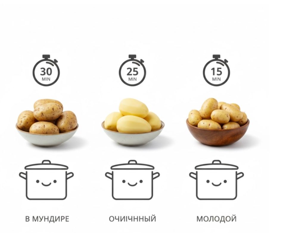 Время термической обработки — базовый параметр. Для картошки стандартное время варки составляет 30 минут после закипания воды. Очищенные целые клубни одинакового размера требуют 20–25 минут. Молодая картошка из-за тонкой кожуры и структуры сварится за 15–20 минут. Нарезанный кубик для супа дойдет до готовности быстрее — за 10–15 минут. Эти цифры становятся точкой отсчета.