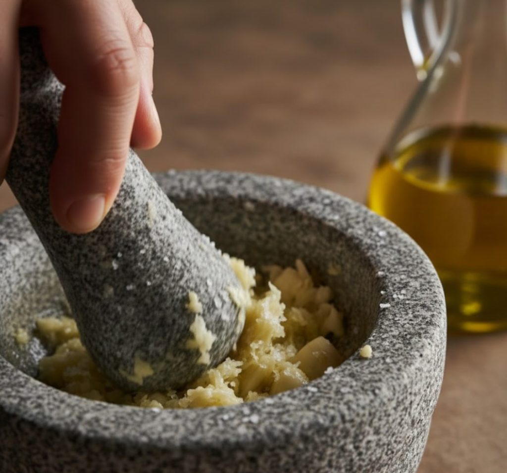 - Секрет успеха: чеснок лучше растереть в ступке с щепоткой соли до состояния пасты — это раскроет аромат и обеспечивает идеально гладкую текстуру эмульсии.