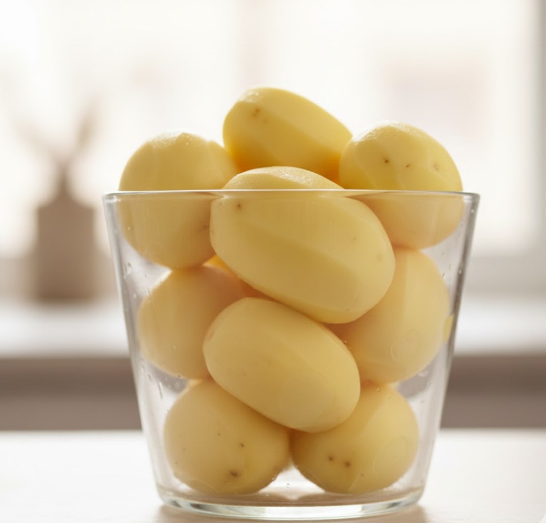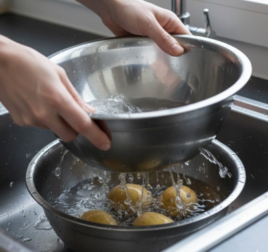 Почему это работает: Кипяток моментально разогревает и размягчает тонкий слой мякоти прямо под кожурой. Резкое охлаждение в ледяной воде заставляет этот слой сжиматься быстрее, чем основная масса клубня и сама кожура. В результате кожура буквально «отстреливается». Метод идеален для очистки большого количества молодого картофеля или подготовки овощей для салата, где важна идеальная форма.